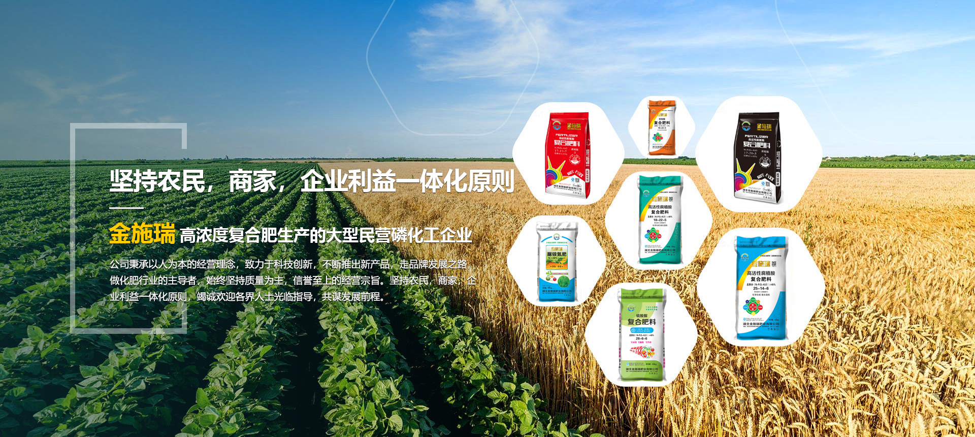湖北金施瑞肥業有限公司是一家以生產高濃度復合肥為主導產品的大型民營磷化工企業,在湖北、河南等地均建有大型的現代化生產基地。根據各地的土壤情況不同由本公司專業的研發機構專門為各地區研制不同配方的化肥,真正做到測土配方施肥。